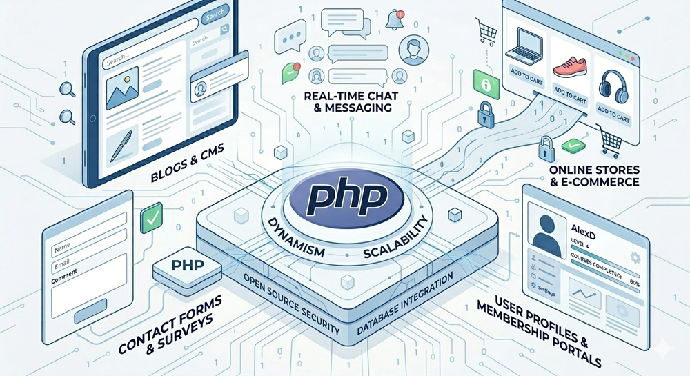 PHPとはサイトに「仕組み」を作るときに使われるプログラミングの言語です。